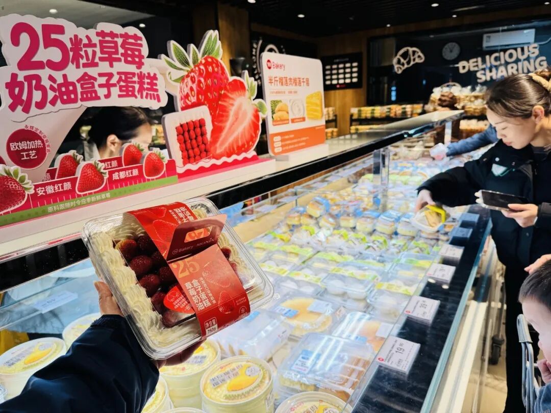 熟食区汇聚多款人气产品,奥尔良烤鸡、板烧黄油鸡腿汉堡等纷纷亮相,以现制现售风味吸引食客。烘焙区则主打草莓奶油盒子,内含整整25颗丹东红颜草莓;以及榴莲千层、核桃满满、丰收的喜悦等畅销单品,凭借真材实料与高颜值成为家庭采购与年轻消费群体的追捧焦点。