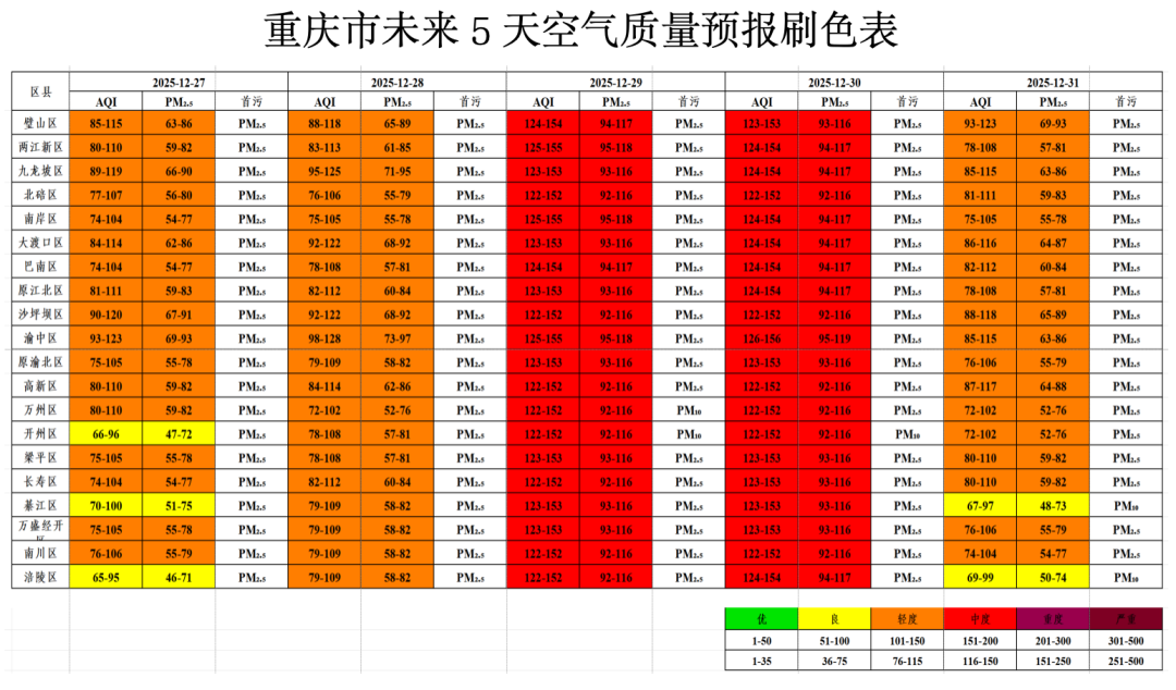 江津区、合川区、永川区、大足区、铜梁区、潼南区、荣昌区自12月26日20时起启动重污染天气黄色预警。两江新区、万州区、涪陵区、渝中区、大渡口区、沙坪坝区、九龙坡区、南岸区、北碚区、巴南区、长寿区、南川区、綦江区、璧山区、开州区、梁平区、万盛经开区、西部科学城重庆高新区自12月27日12时起启动重污染天气黄色预警。