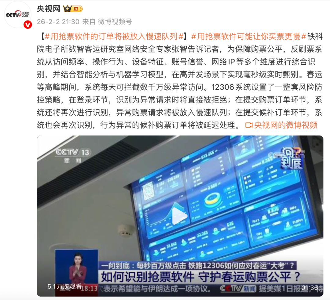 据央视网报道,在12306技术中心,铁科院电子所数智客运研究室网络安全专家张智告诉记者,为保障购票公平,反刷票系统从访问频率、操作行为、设备特征、账号信誉、网络IP等多个维度进行综合识别,并结合智能分析与机器学习模型,在高并发场景下实现毫秒级实时甄别。